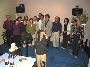 ![]() コンサートを控え合同練習に励むメンバー。 手前が会長の灰原美智子さん (名張市夏見の歌謡スタジオ「ききょう」店内で) |