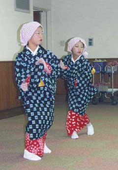 | 名張市のボランティアグループ「青空会」(代表*坂進一郎さん)はこのほど、百合が丘の老人保健施設ゆりの里を訪れ、自慢の歌と踊りで楽しいひとときをプレゼントした。 毎年この時期の恒例で、 ホールにはこの日を心待ちにしていた約五十人のお年寄りが集合。「瞼の母」の歌や踊り「かっぽれ」などが披露され、最後は全員で「りんごの歌」を合唱。、同会からキャンデー、赤目町新川、小林由美子さんから手づくりパンが贈られた。 出演者は次のみなさん。 原田久美子、卯月さなえ、塚口陽子、あやかとあかね℃ハ真、坂口美佐子、阪口まさみ |