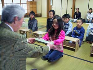 | 名張能楽振興会が主催する児童謡曲仕舞教室(杉原邦巳代表)の第九期がスタートした。名張公民館でこのほど開講式が開かれ、新規の受講生五人も先輩にまじって初めての稽古を経験した。 観阿弥ゆかりの地で子供のうちから能楽に親しめる場を、と平成四年に開講され、対象は幼稚園児から中学生まで。同振興会の新春謡曲仕舞大会をはじめ、県民文化祭や国民文化祭などの舞台に立つ。教室は今年度から市教育委員会との共催となった。 新しい受講生は、小学二年生から四年生まで男子二人、女子三人。開講式で杉原代表から謡曲と仕舞の話を聞いたあと、卒業まで貸与される仕舞扇を手渡された=写真。つづいて、先輩の受講生五人が仕舞「熊野」と連吟「鶴亀」を披露し、新入生は真剣な表情で見守っていた。 |