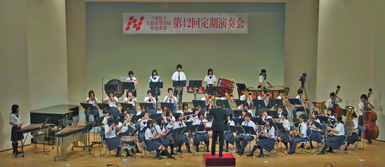 県立名張高校(大市智子校長)の吹奏楽部による第四十二回定期演奏会が十日、名張市青少年センターで催され、部員たちは満員の聴衆の前で練習の成果を披露した。夏の吹奏楽コンクールを終えたあと、秋に迎える年間最高のステージが定期演奏会。毎日の練習のほかに合宿もこなして、一年生から三年生までが晴れの舞台に立った。 部員たちは、顧問の堀昌弘教諭の指揮でコンクールの課題曲や「ファンタジー」をテーマにした曲などを熱演し、大きな拍手を集めていた。 |