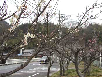 名張市大屋戸、杉谷神社参道の梅並木が数日前から一気に膨らみ、紅梅・白梅ともに美しい彩りを見せている。 同参道の梅並木は約100本。古くから梅の名所で知られている。今年は3月に入って も小雪がちらつくなど、厳しい寒さが続いたため、開花は昨年より約1か月遅れていると いう。 開花はまだ梅の木によってばらつきはあるが、参道脇を走るドライバーたちは「寒さも峠を越したかな……」と、春の足音を感じ目を和 |