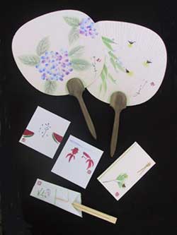 | さわやかに仕上げる。「15分あれば1点できあがりますから、いまでは四季彩画が生活の一部になっています」という主婦も。和紙やはがきのほか、うちわや祝儀袋、さらに座布団カバーなどの布類に描くことも可能だという。 開講は月4回。第2・4火曜の午前と第1・3土曜の午後に、いずれも1時間半。受講は月2回で3,000円。休んだときの手本は次回に示されるため、休んでいてもレパートリーが増える。材料費は5,000円程度。開講日には無料体験を実施。詳細は同教室(電話0595・64・0468)へ。 |