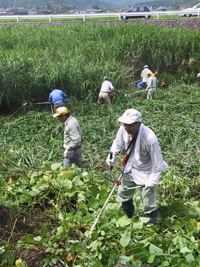 地域の美化は住民の手で│。名張市赤目町丈六地区の五十歳以上の男性有志による「丈六五十路会」(野口健会長、三十六人)はこのほど、地域内を流れる滝川の土手で草刈りに汗を流した。 同会は一九八二年の結成。親睦を主体に活動しているが、先輩会員が植えた桜並木の手入れなど、奉仕作業にも力を入れている。桜の下草刈りは毎年の恒例だが、今年は地域の財産である滝川の河川敷もきれいにしようと相談がまとまった。 作業は日曜日の午前。二週連続で行い、役員は両日、一般会員は都合のいい日を選んで参加した。草刈り機やカマを手に集まった会員は、人の背丈より高い雑草が生えた河原に降りて、手際よく刈り取り。両日とも暑い一日となり、汗まみれの作業がつづけられた。 滝川は観光名所の赤目四十八滝を源流とする清らかな流れだが、近年は環境が大きく変化。丈六地区には普通のホタルよりも大きな「丈六ボタル」が生息していたが、その数も激減したという。 野口会長は「地域の環境を再生して、むかしのようにホタルが乱舞する川を取り戻したいと願っています」と話している。